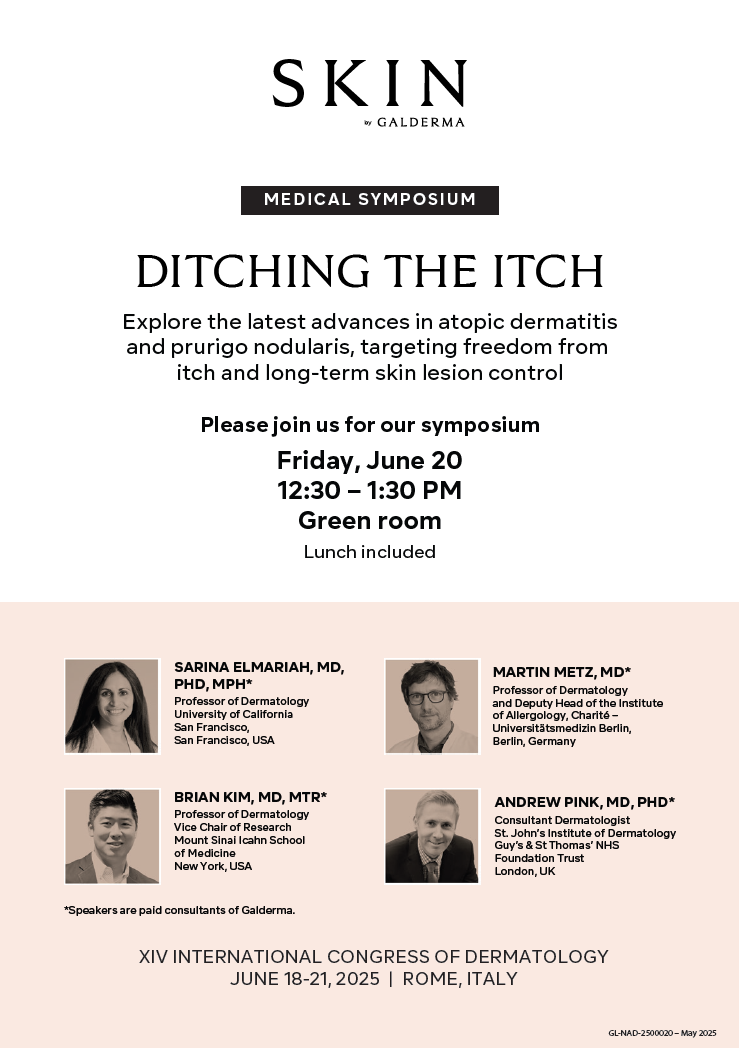 Galderma will also host a symposium at ICD, exploring the latest advances in addressing itch and lesion control in both prurigo nodularis and atopic dermatitis. Further details can be found here and below.